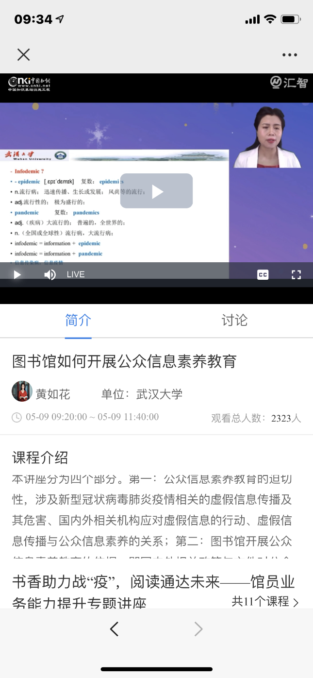 5月9日上午9:30图书馆(档案馆、校史馆)数字服务部组织2020年度第二次部门业务能力提升线上直播专题活动。课程武汉大学黄如花教授主讲,课程主题是从重大突发公共卫生事件的应对谈信息素养教育的迫切性——“图书馆如何开展公众信息素养教育”。