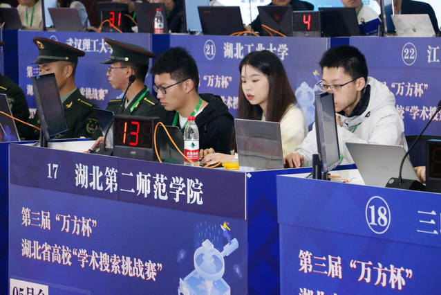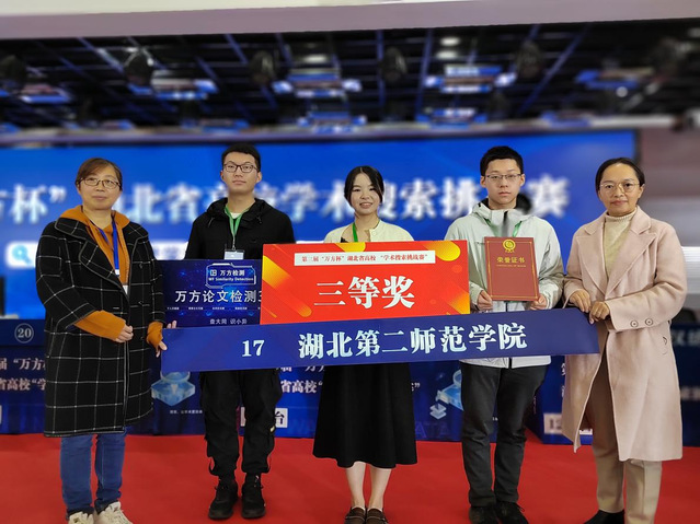(通讯作者 汪先莉)11月6-7日, 由湖北省高校图工委、湖北省高校数字图书馆举办的第三届湖北省高校“学术搜索挑战赛”总决赛在武汉大学图书馆总馆学术报告厅举行。本次大赛共有65所高校近2.3万名本科及硕士研究生参与,范围广,难度高。在经历了网上初赛、校内选拔和全省复赛之后,来自华中科技大学、中国地质大学(武汉)、华中师范大学等24所高校代表队进入总决赛。我校由计算机学院刘子毅、郭世琦和马克思主义学院段贞三位同学组成的代表队获得三等奖,薛淑峰、汪先莉两位老师荣获“优秀指导老师”奖。
