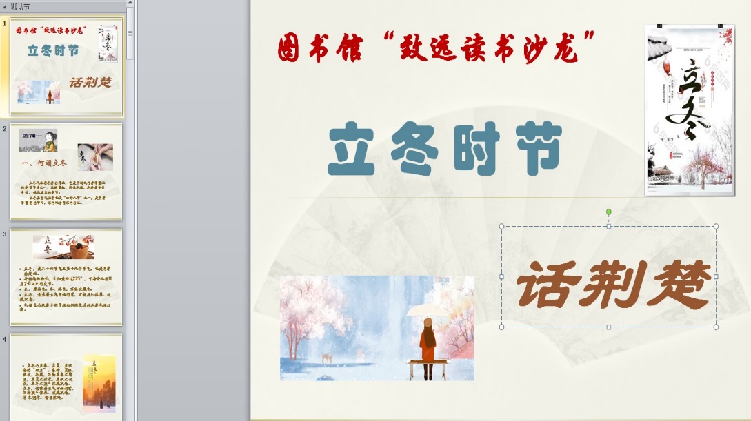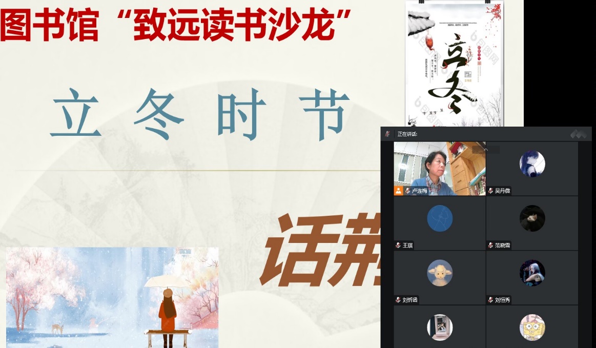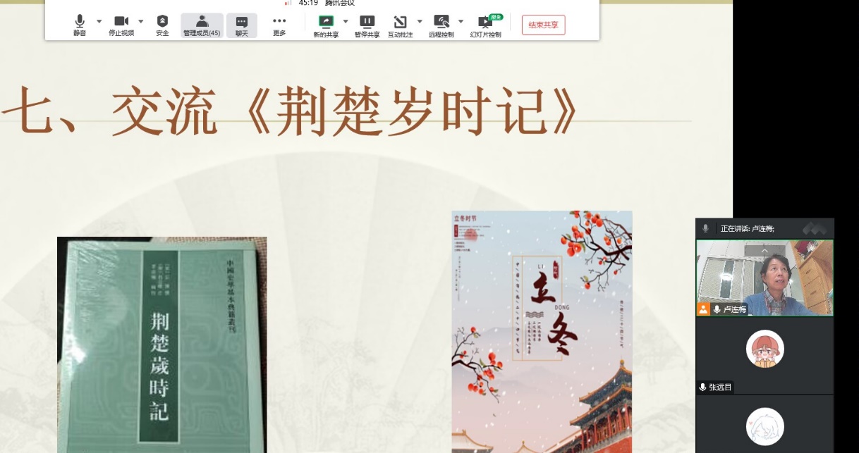 本网讯(通讯员卢连梅)2022年11月7日,是传统文化中的立冬日,是我国二十四节气中的第19个节气,为引领读者对传统文化的关注,为激发大学生的读书热情,图书馆副研究馆员卢连梅老师与图书馆悦读营读书会的45位成员,在11月7号晚上6:00—8:00,利用腾讯会议网络平台进行了一场线上读书沙龙活动。活动伊始,卢老师为同学们介绍了立冬的渊源和节令习俗,同学们也饶有趣味谈自己家乡立冬时的风俗,大家围绕《荆楚岁时记》这本书展开对荆楚之地历史文化的追溯与思考,来自数学与经济学院的张远目同学和管理学院的李佳荣同学畅谈读书的收获与感受。沙龙结束,同学们感觉受益匪浅,大家表示今后继续关注和参与图书馆的各类读书活动。