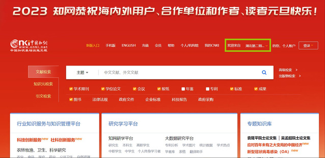 4.跳转至“中国知网页面”,右上角会显示“欢迎来自湖北第二师范学院的您”,说明登录成功,即可访问图书馆订购的中国知网(CNKI)学术资源。