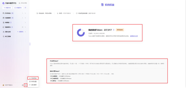 访问,通过手机号注册个人账号,通过IP地址识别机构,在账户内发放50万token(token是产品的计量单位,类似一种余额)。可通过左下角的机构权益查看剩余token