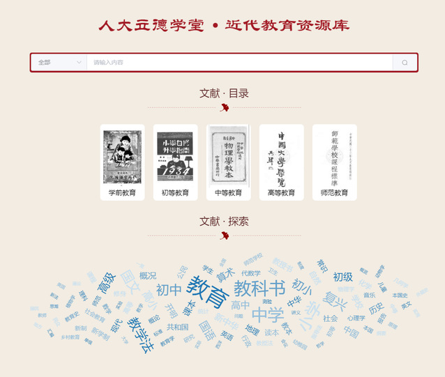 “人大立德学堂”近代教育资源库是专业提供我国近代教科书、参考书等教育资源的数据库,收录了我国从晚清至民国时期各类教科书及教学参考资料,内容主要涵盖二十几个大类,能满足不同学科、不同层次用户的需求,是深入研究我国近代教育史及发展的重要的文献资源。对近代教育资源的深度研究,可从不同层面为现代教育的改革和发展提供积极的经验意义和参考借鉴。