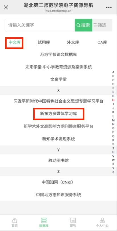 2.①点击底部的“资源”→②“校外远程访问”→③“常用数据库”→④“中文库”→⑤选择“新东方多媒体学习库”进入主页面→⑥点击“直播”进入直播课堂→⑦选择3月找到“春季启航:2026考研规划全攻略”直播课即可收看。(首次访问请先在校园网内完成“注册”,谢谢配合!)。