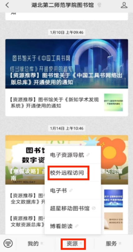 1.关注“湖北第二师范学院图书馆”微信公众号,进入首页。
