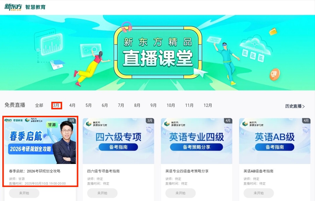 图书馆的晨光与星光,终将见证每一份执着的绽放。为助力大家科学规划备考之路,图书馆联合新东方多媒体学习库举办“春季启航:2026考研规划全攻略”主题讲座,欢迎大家准时收看!具体安排如下: