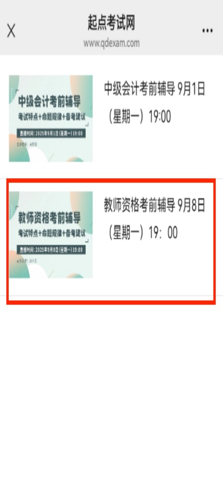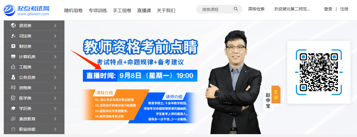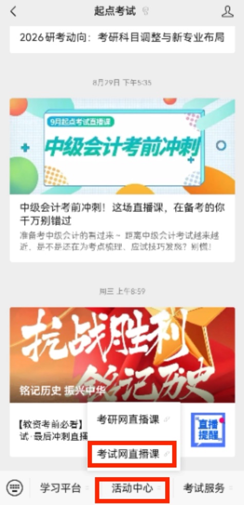①用手机微信扫描下方二维码进入起点考试首页→②点击底部菜单“活动中心”→③选择“考试网直播课”进入新页面→④点击观看对应的直播课程即可。