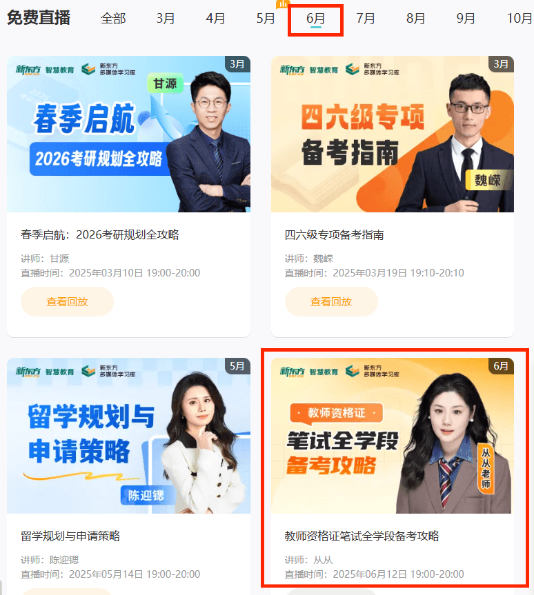为了帮助大家科学备考教资考试,精准把握学段差异、构建系统化知识框架、突破备考效率瓶颈,图书馆联合新东方多媒体学习库为大家带来“教师资格证笔试全学段备考攻略”线上主题讲座!欢迎大家准时收看!具体安排如下: