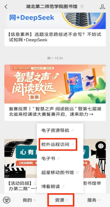 1.关注“湖北第二师范学院图书馆”微信公众号,进入首页。