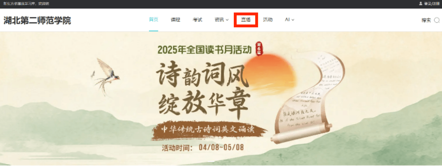 ①在湖北第二师范学院图书馆主页→②点击“本馆资源”→③找到现有数据库→④选择“新东方多媒体学习库”点击进入主页面→⑤点击“直播”进入新页面→⑥选择6月找到“教师资格证笔试全学段备考攻略”直播课即可收看。