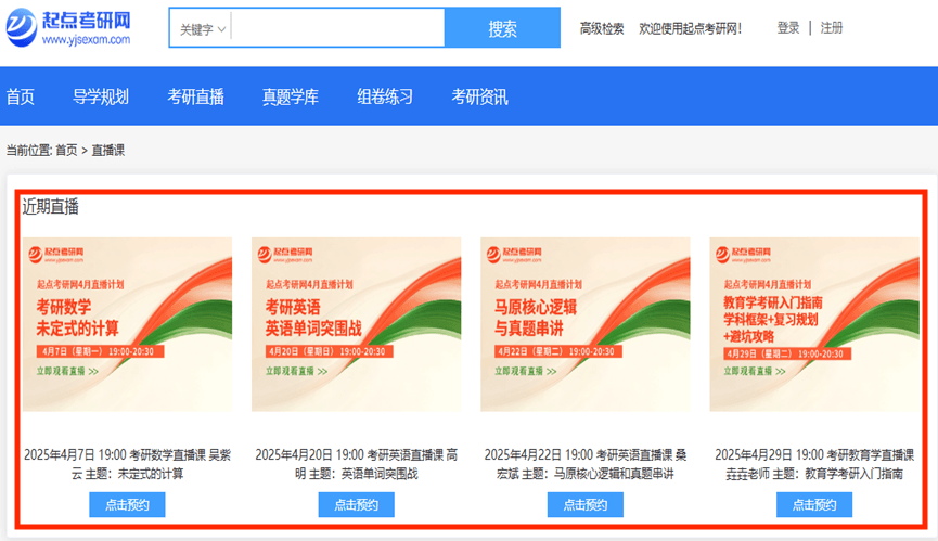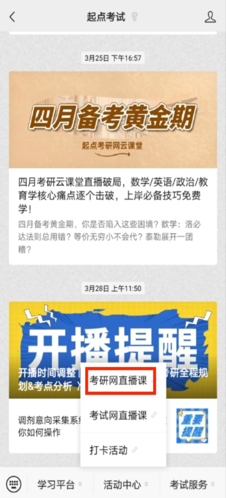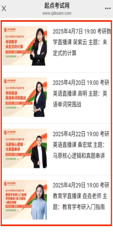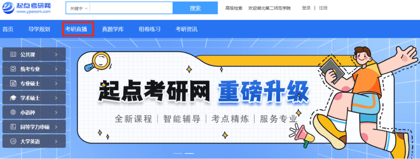 ①用个人手机微信扫描下方二维码进入起点考试首页→②点击底部菜单“活动中心”→③选择“考研直播课”进入新页面→→④点击观看课程即可。