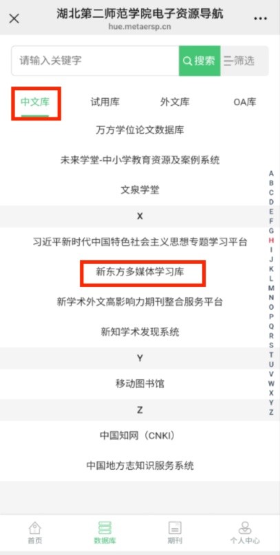 2.①点击底部的“资源”→②“校外远程访问”→③“常用数据库”→④“中文库”→⑤选择“新东方多媒体学习库”进入主页面→⑥点击“直播”进入直播课堂→⑦选择3月找到“四六级专项备考指南”直播课即可收看。(首次访问请先在校园网内完成“注册”,谢谢配合!)。