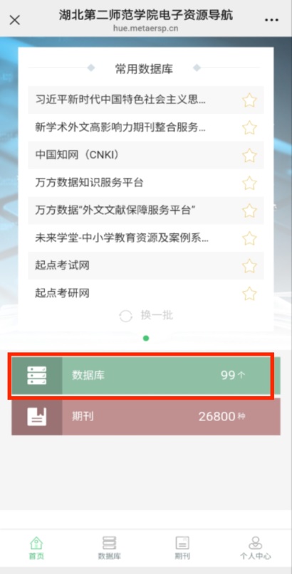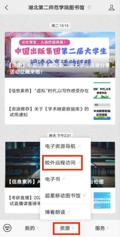 1.关注“湖北第二师范学院图书馆”微信公众号,进入首页。