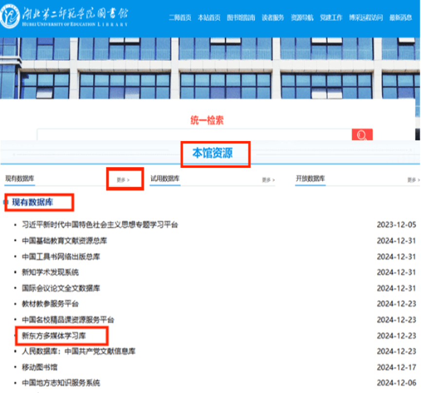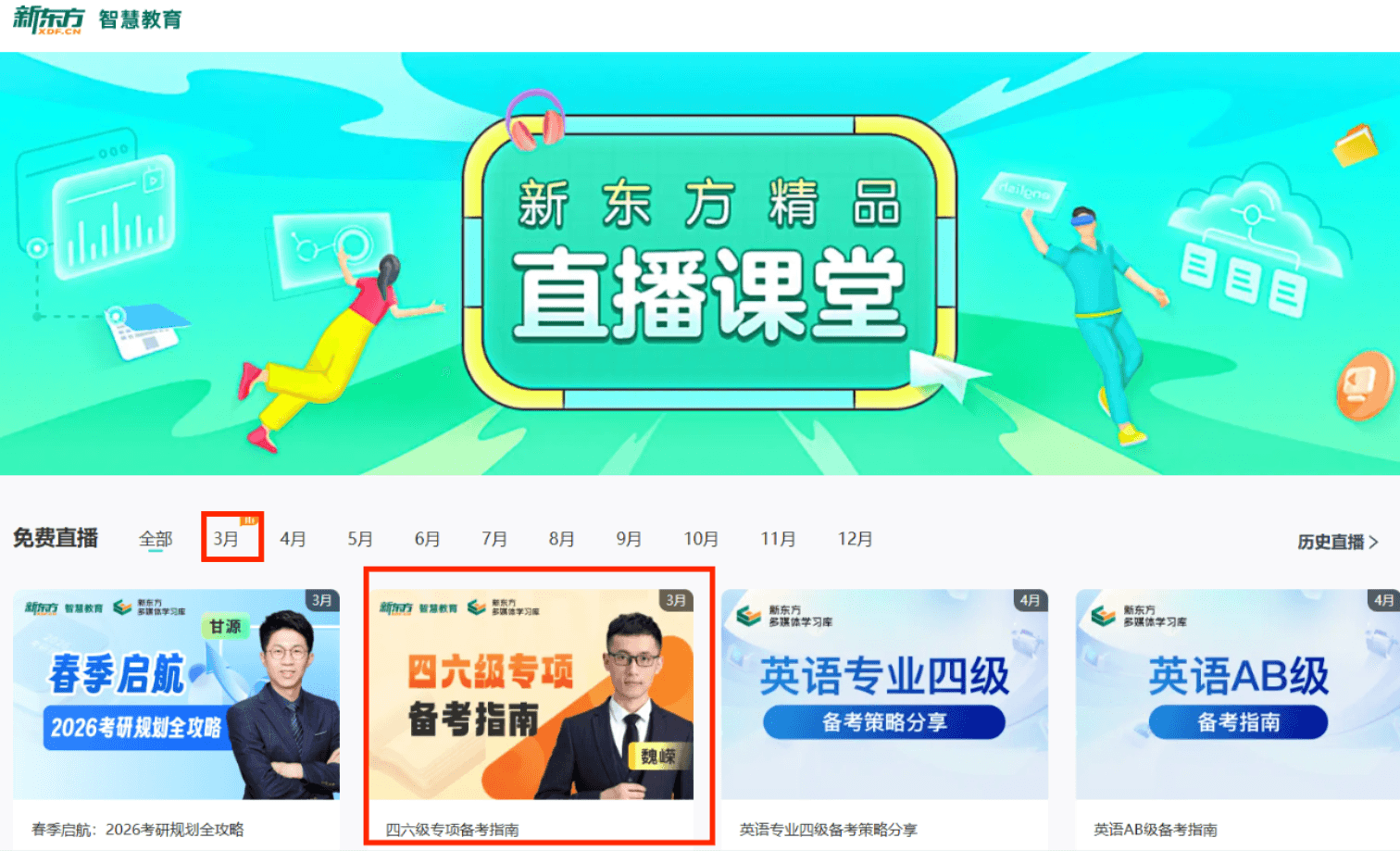①在湖北第二师范学院图书馆主页→②点击“本馆资源”→③找到现有数据库→④选择“新东方多媒体学习库”点击进入主页面→⑤点击“直播”进入直播课堂→⑥选择3月找到“春季启航:2026考研规划全攻略”直播课即可收看。