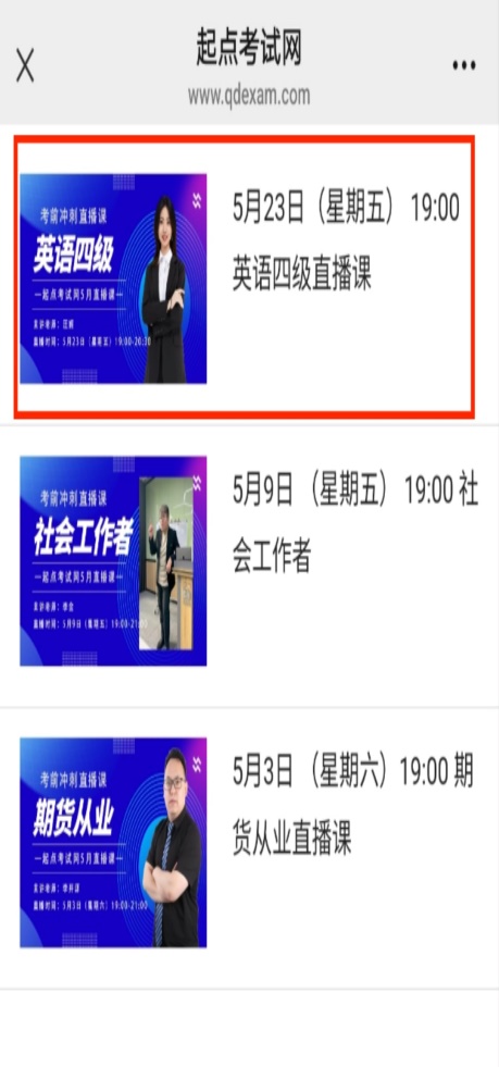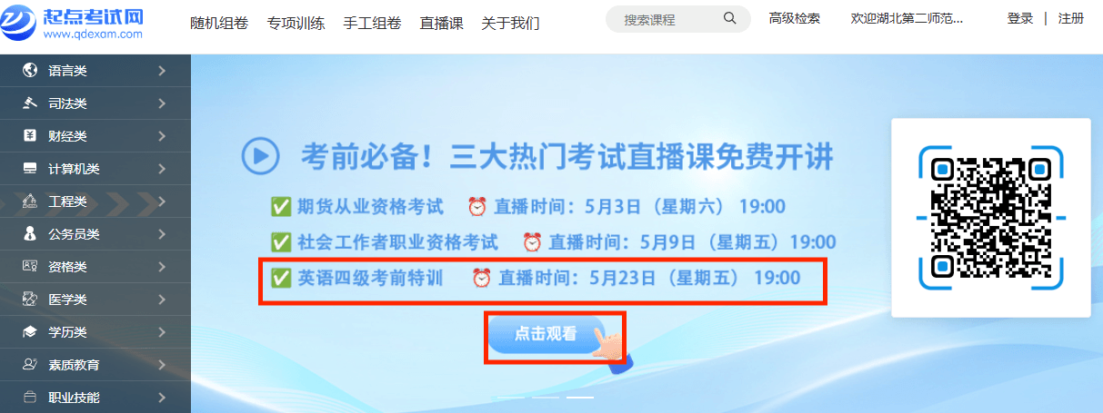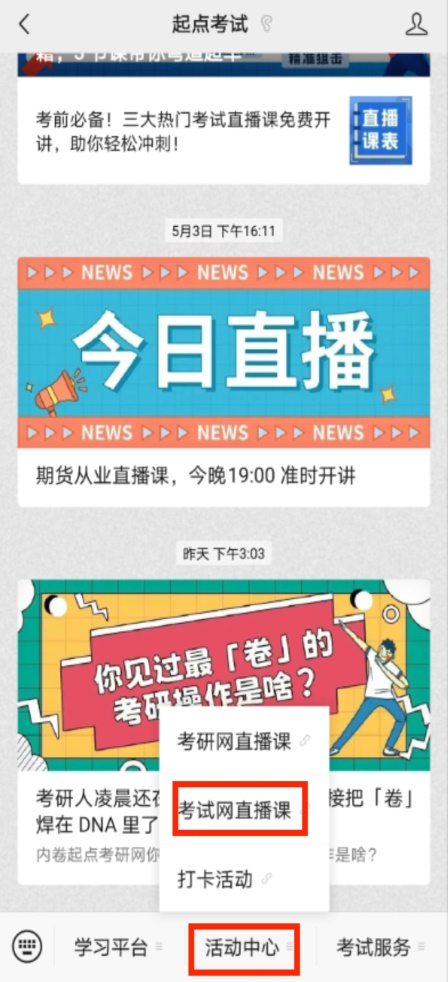 ①用手机微信扫描下方二维码进入起点考试首页→②点击底部菜单“活动中心”→③选择“考试网直播课”进入新页面→④点击观看对应的直播课程即可。