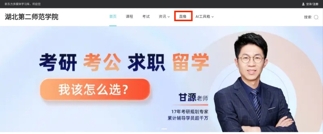 ①在湖北第二师范学院图书馆主页→②点击“本馆资源”→③找到现有数据库点击“更多”→④选择“新东方多媒体学习库”点击进入主页面→⑤点击“直播”进入直播课堂→⑥选择4月找到“英语专业四级备考策略分享”直播课即可收看。