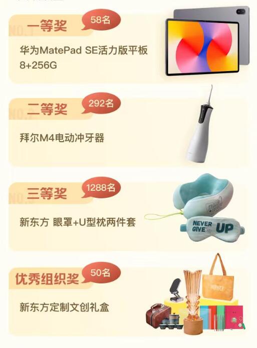 1.活动开奖日统一开奖,按照一等奖、二等奖、三等奖的顺序,依次从满足获奖资格的参与者中随机抽取获奖者,每人仅一次获奖机会,奖品与奖项设置均由新东方智慧教育负责。