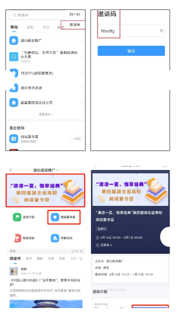 (三)在首页右上角输入邀请码“hbydtg”,进入湖北阅读推广主页。点击轮播图参与活动。