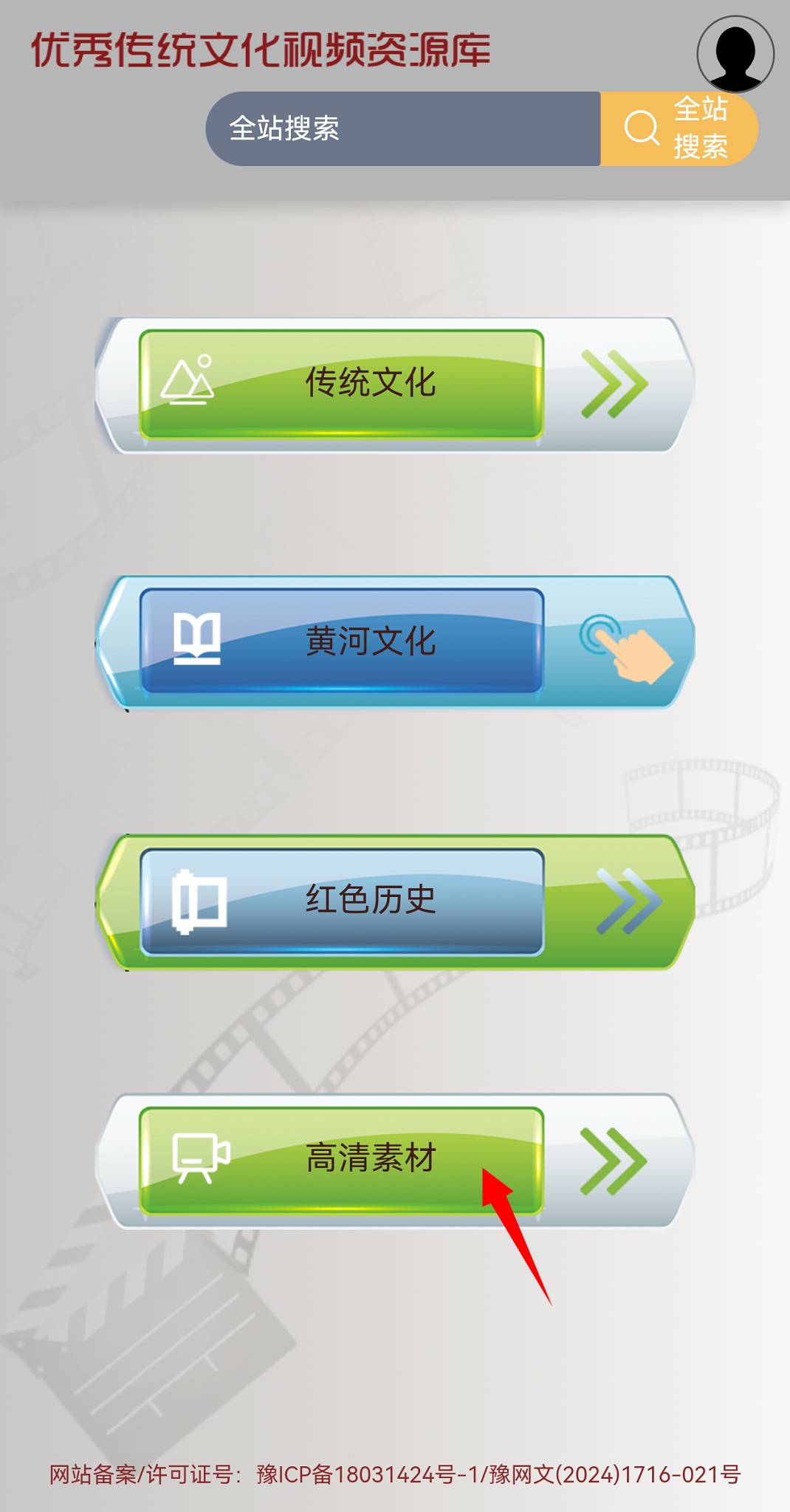 通过校园网站、微信公众号、搜索https://www.hnhzjcm.com/打开链接,优秀传统文化视频资源库——高清素材——搜索,可免费下载素材,操作流程如图所示: