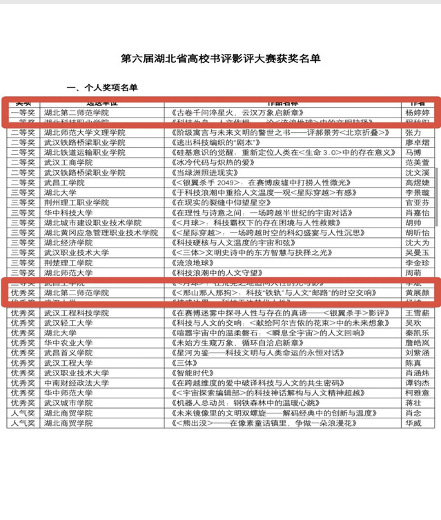 本次大赛以“科技与人文:经典作品中的未来想象”为主题,旨在深入贯彻党的二十大精神,推动全民阅读与创新教育融合发展,引导大学生通过经典作品思考科技与人文的互动关系,活动自4月开展以来,历时两个月,共有82所高校师生报名,初赛作品4224个。图书馆高度重视,精心策划了“第六届书评影评大赛校内选拔赛”,作为图书馆2025年“悦读经典共沐书香”阅读推广系列活动之一,积极组织全校学生参加。经过1个多月的沟通与指导,又经层层筛选,最终,图书馆从近30多个征集作品中,选送了教育科学学院杨婷婷同学、文学院黄展颜同学的作品参加复赛,经湖北省高校图工委阅读推广专业委员会组织专家评选,我校推荐作品在复赛163个作品中脱颖而出,获得佳绩,图书馆陈雯获“优秀指导老师”称号。