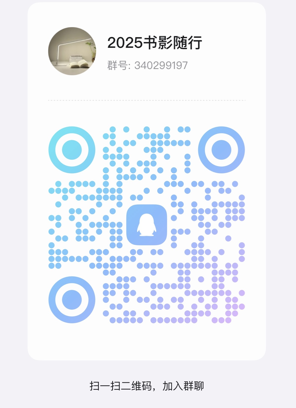 请本校参赛选手扫码加入“2025书影随行”QQ群,便于联系和交流。群号:340299197。