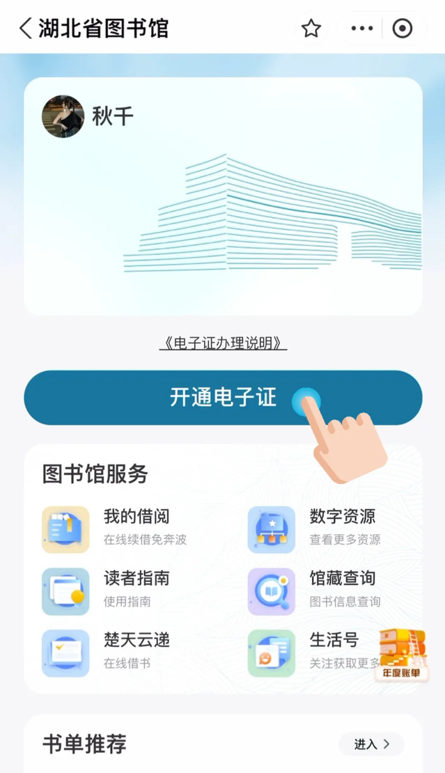 享受实体证同等待遇,解锁全部VIP体验:一键借还12本纸质图书、馆藏书目秒查、天量数字资源随意用、定制书单推荐、楚天运递图书寄送到家、限量精品大咖讲座、品牌活动优先报名等。