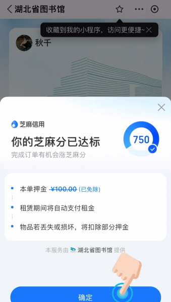 打开支付宝,扫描下方二维码,或搜索湖北省图书馆,进入支付宝小程序。