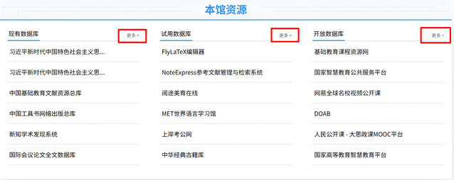 2. 登录图书馆主页(网址:http://tsg.hue.edu.cn)——在“本馆资源”下方查看各类数据库资源——点“更多”浏览全部内容。