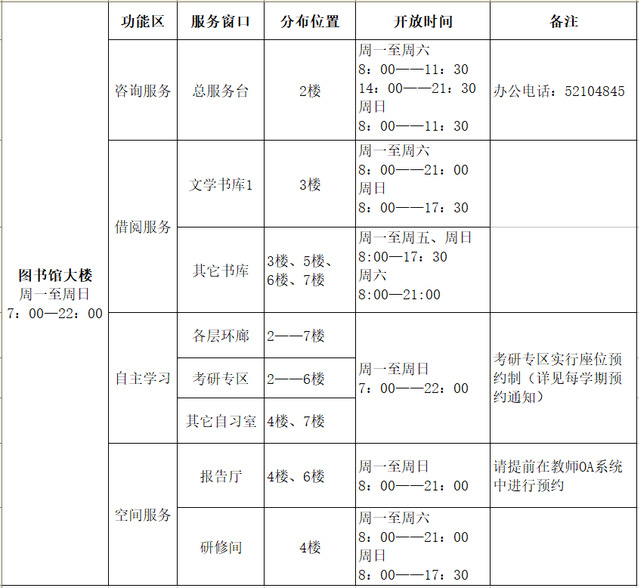 本馆大楼开放时间:7:00——22:00,进入图书馆需保持安静,遵守图书馆各项规则,做文明守纪的读者。