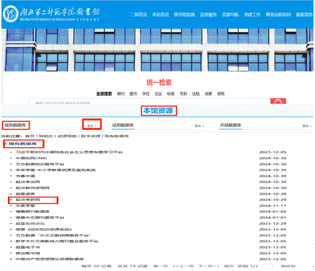 ①在湖北第二师范学院图书馆主页→②点击“本馆资源”→③在“现有数据库”中→④点击“更多”→⑤选择“起点考研网”进入主页→⑥点击“考研直播”栏目进入新页面→⑦点击预约用微信扫码进行收听即可。