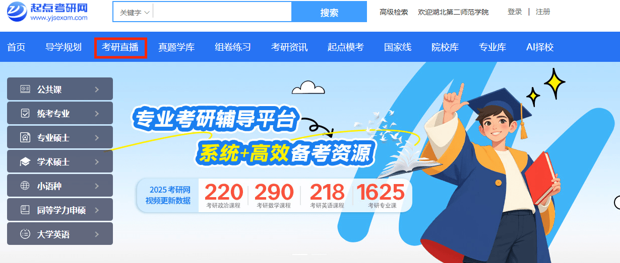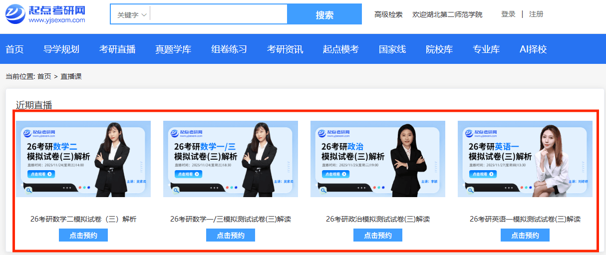 为助力我校考研学子高效备战、精准冲刺,图书馆联合起点考研网特别推出“摸底自测·查漏补缺·迎战26考研!”直播课,本次直播旨在帮助大家快速定位薄弱环节、合理分配答题时间、系统梳理核心考点,助力复习冲刺阶段方向更明、效率更高!欢迎同学们准时收看,积极参与,为考研最后一程蓄力加油!