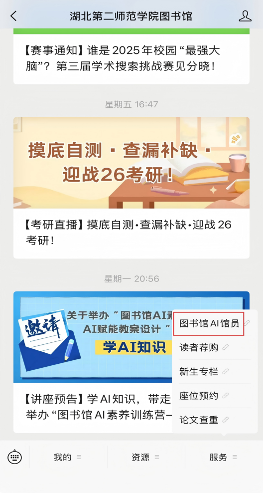 1.关注“湖北第二师范学院图书馆”微信公众号,在“服务”栏目中点击“AI馆员”,即可与本系统进行互动。