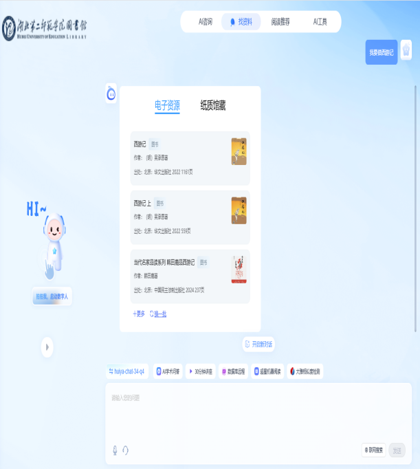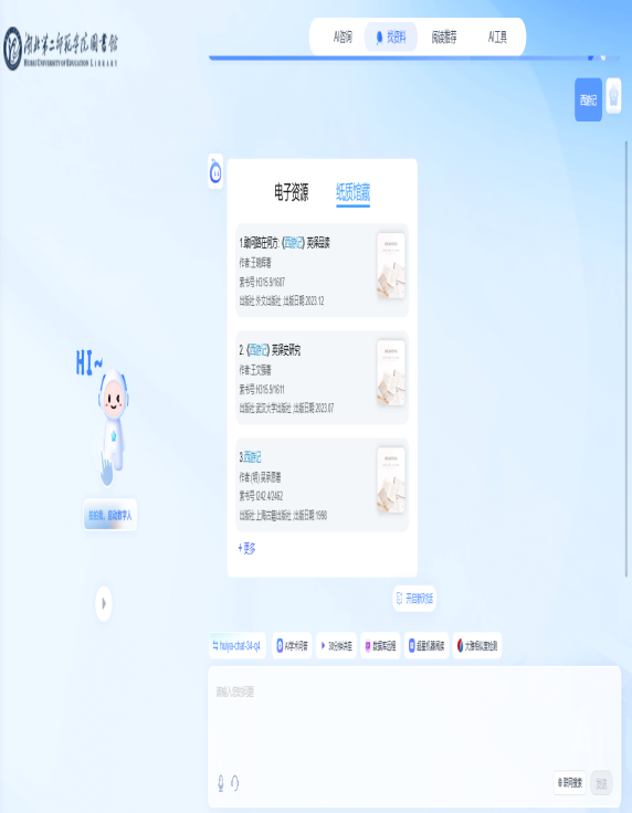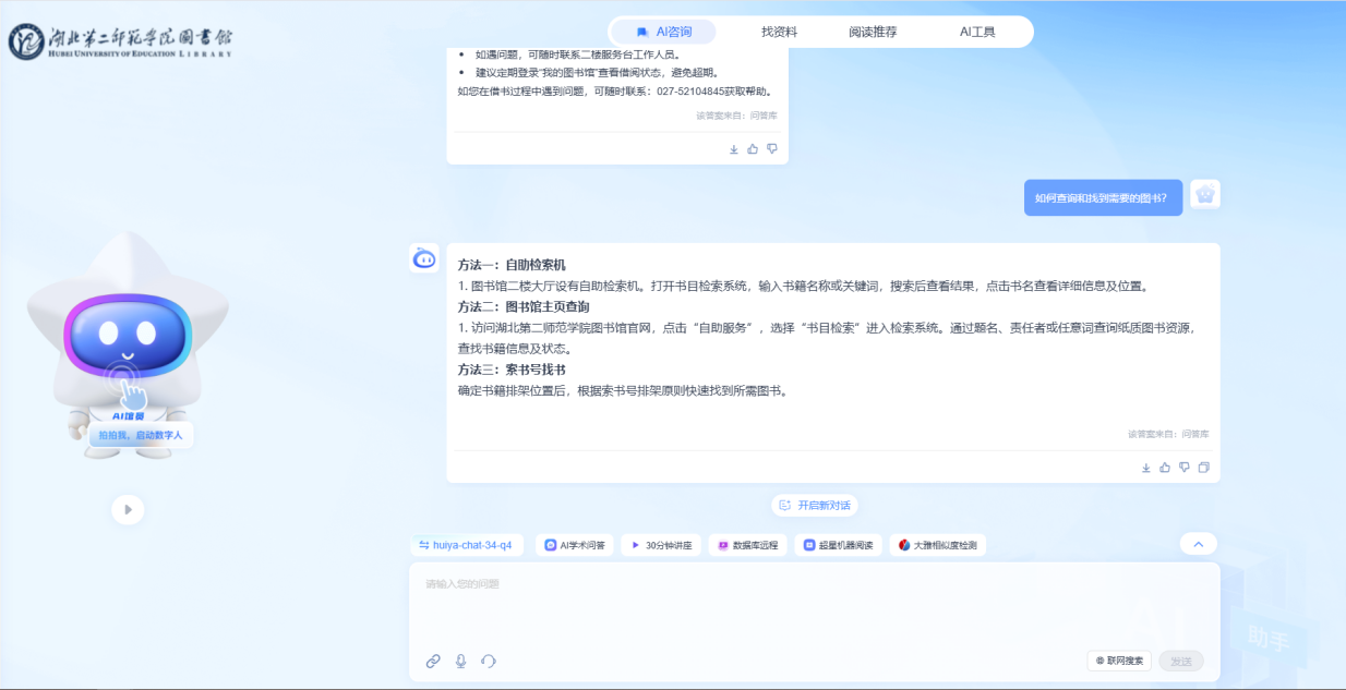还在为找不到喜欢的书而抓狂吗?还在被图书馆借还流程搞得晕头转向吗?还在为写论文挠破头皮吗?别愁啦,湖北第二师范学院图书馆的AI馆员上线啦!