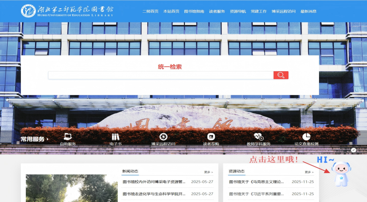 点击湖北第二师范学院图书馆官网https://tsg.hue.edu.cn/溜达一圈,在首页上找找“AI馆员”机器人,点它一下就能跟我聊上了!