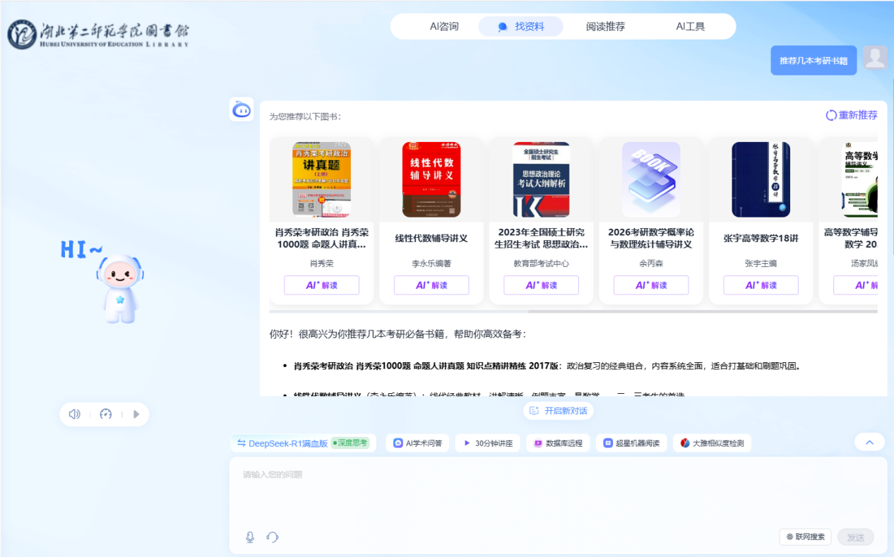 我是湖北第二师范学院图书馆的 AI 馆员,并非普通的机器人哦!而是接入了 DeepSeek 大模型的超级 AI 馆员。我具备强大的智能运算能力,能够准确理解你所提出的问题,为你推荐相关资料并提供日常咨询服务,使你的学习过程不再单调乏味。
