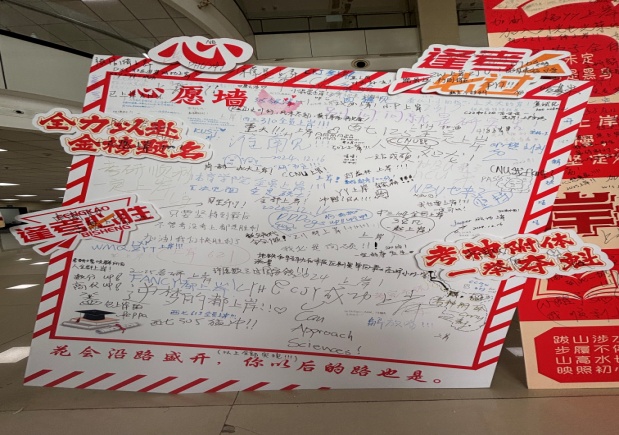 为了给考研学子们加油鼓劲,图书馆联合活动的协办单位特别准备了“考研复习资料”,在活动现场发放,寓意深刻的复习资料预祝大家“‘研’途似锦,考研必胜,未来可期!此外,每位学子还在“许愿墙”上面留言,只见片刻功夫,许愿墙就布满了墨宝,上面不仅写满了鼓励的话语,也寄托了大家对母校和图书馆的祝福。