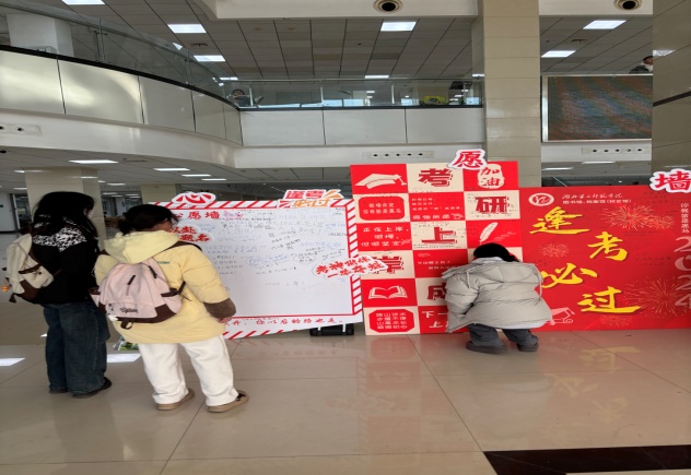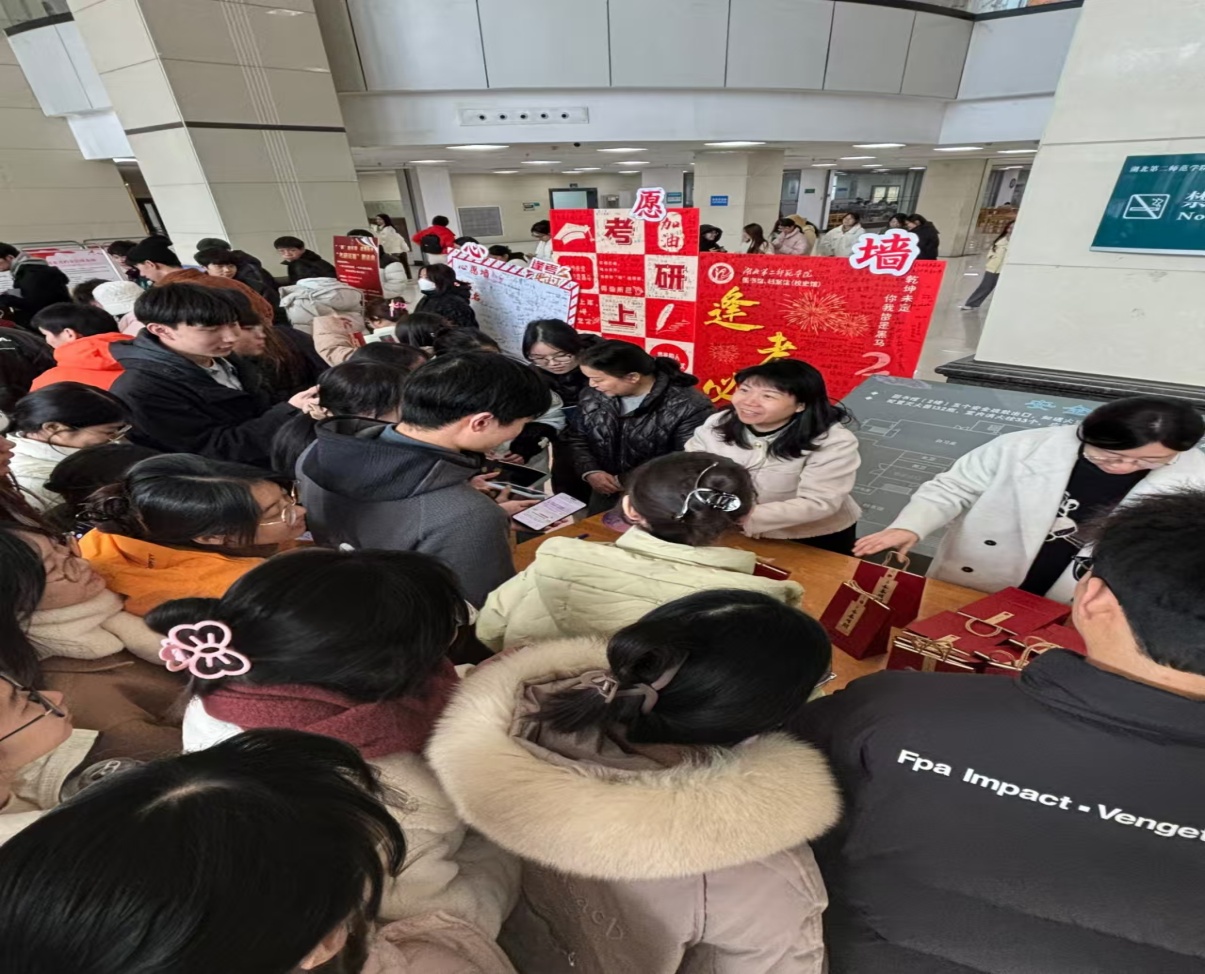 随着2025年全国硕士研究生招生考试的脚步越来越近,湖北第二师范学院的考研学子们在2024年冬季感受到来自学校图书馆的特别温暖。12月17日中午,在图书馆二楼大厅处举办了“‘研’途璀璨,温情相伴——考研送暖”主题活动,通过“许愿墙”、“领资料”和“送福袋”等方式,为本校考研学子鼓舞士气。预祝2025届考研学子们“一举高中,金榜题名”!