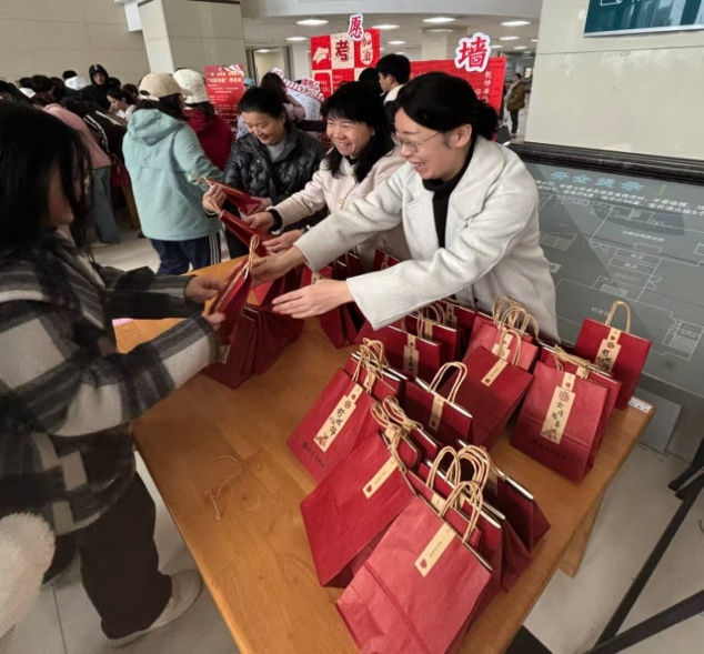 活动现场,图书馆、档案馆(校史馆)党总支书记、馆长彭敏、副书记石虹、以及副馆长刘晓静亲切询问了同学们的备考情况,并对他们的努力表示肯定。她们亲手为学子们送上精心准备的礼品“福袋”,鼓励同学们要保持信心,积极面对即将到来的考试,同时也要注意身体健康。