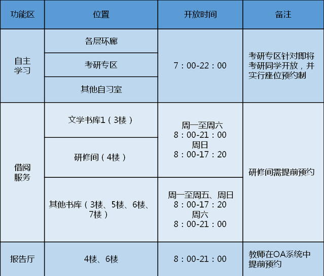 节假日开放时间请关注图书馆微信公众号、图书馆网站及馆内相关通知,您在使用中有任何问题请联系图书馆总服务台:027-52104845。